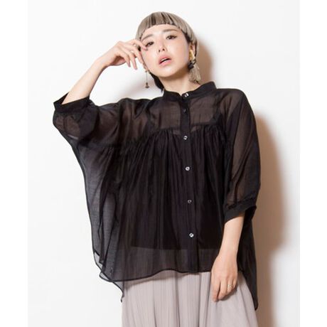 [型番:599006-256B]甘くふんわり広がるギャザーブラウスは、シアー素材でセンシュアルな一面も。羽織として、陽射し除けや冷房対策にもオススメ。===========================透け感: あり伸縮性: なし光沢感: 僅かにあり裏地: なし素材について: 表面にツヤのある、非常に軽く柔らかなブラウス地===========================