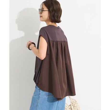 *前後で違う素材を組み合わせたデザインカットソー。・後見頃をシャツ素材で切り替えたバルーンフレアトップス。