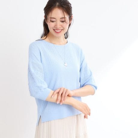 グラフィカルな透かし柄を袖に施したプルオーバーニット。