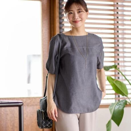 デニム調に見しえる素材を用いたラフ感のあるプルオーバーブラウス。