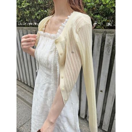 透け感を加えた軽やかなニット生地で、室内などの羽織りものとしてぴったりな長袖シアーカーディガンです。程よい透け感と立体的なリブ編みが華やかな雰囲気です。フィット感のあるシンプルなデザインで、ワンピースやキャミソールなどのカーディガンとしても、ボタンを留めてプルオーバーとしても着用が可能です。胸元にはミニサイズのSNIDELロゴプレートを添えてリッチ感をプラス。カラーバリエーションも豊富にご用意しました。