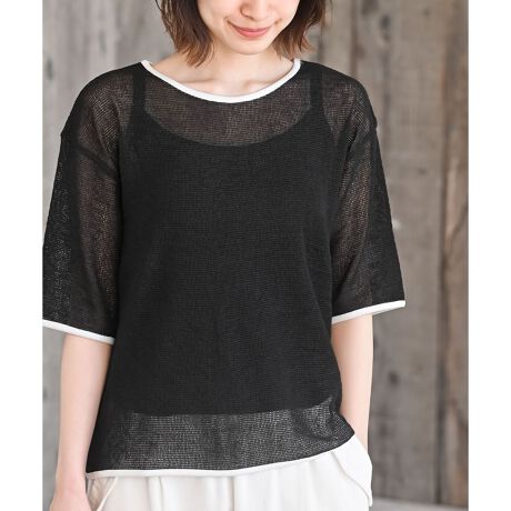配色のトリミングがアクセントになったシアートップス