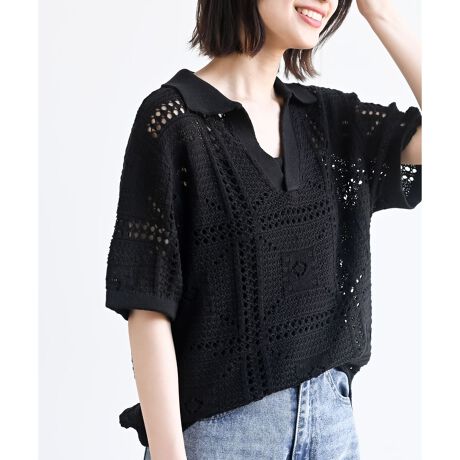 品よくラフに着られる襟付き透かし編みニット