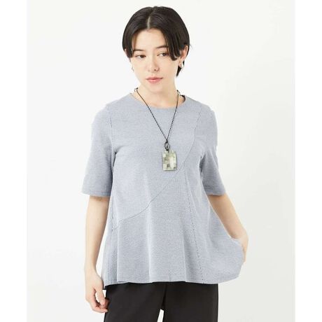 身頃の切り替えでストライプに動きをつけたカットソー。フレアデザインにすることで、ウエストがすっきりと見えるようにこだわったシルエットです。ピケ素材ならではの凹凸感から生まれる柔らかな風合いが魅力です 。肌離れも快適な素材で、暑い日でもさらっと心地よく着られるのも魅力です。