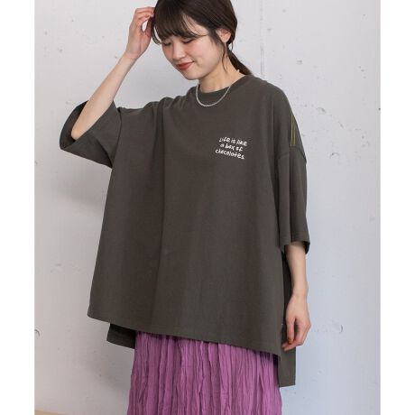 存在感たっぷりのオーバーシルエットTシャツ。フロントは刺繍、バックにはプリントでラフな手書きのメッセージが入っています。前後差のある裾と脇のスリットが抜け感を演出。コーディネートの幅を広げるアイテムです。