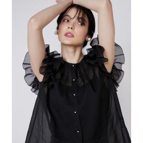 ■デザインリネン風の涼しげで扱いやすく透け感のあるフリル袖ブラウス。衿ぐりはベージュに黒、黒には同色の艶感のある別生地で縁取った品のあるデザイン。肩は緩やかに丸みをつけたシルエットで、袖先に大胆なフリルをあしらい、一枚でも華やかで二の腕が細見えが叶うトップスです。同素材スカートとのセットアップで華やかなワンピース見えはもちろん、デニムやガウチョパンツとの合わせで上品なカジュアルスタイルなど、着回し効く優秀アイテムです。・ベージュのみ裏地あり・水洗い可同素材のスカート品番:5152152012■素材スパンポリエステルのオーガンジーに樹脂加工を施し、マイクロリネンパウダーを固着させることにより、よりリアルなリネン調を表現しました。透け感を生かしたレイヤードスタイリングやボリュームのあるドレープ使い、幅広いスタイリングにマッチし、洗練された装いを演出できる素材です。■サンプル撮影商品■こちらの商品はサンプルでの撮影となっております。実際の商品とは、サイズや色味、素材、デザイン等の仕様が若干変更になる場合がございます。