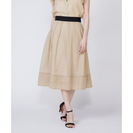 ■デザインウエストのグログランベルトがポイントのタックスカート。トレンドの透け感のあるオーガンジー素材を使用し、上品で軽やかな印象に。ミディ丈で程よく使いやすい丈感も魅力です。裾にはベージュに黒、黒には白の配色のWステッチを施し、タックの分量や透け方を計算し、着た際に一番美しく見えるように細部までこだわったデザインです。すっきり上品なロゴTシャツとのスタイリングでカジュアルにも、ボウタイブラウスとの合わせで通勤にも対応できる万能スカート。様々なトップスと相性が良く、着回し力も抜群です。・水洗い可・ポケットあり・ウエストゴム仕様同素材のブラウス品番:5152182012■素材スパンポリエステルのオーガンジーに樹脂加工を施し、マイクロリネンパウダーを固着させることにより、よりリアルなリネン調を表現しました。透け感を生かしたレイヤードスタイリングやボリュームのあるドレープ使い、幅広いスタイリングにマッチし、洗練された装いを演出できる素材です。■サンプル撮影商品■こちらの商品はサンプルでの撮影となっております。実際の商品とは、サイズや色味、素材、デザイン等の仕様が若干変更になる場合がございます。