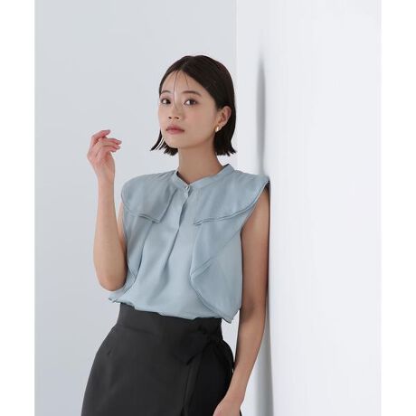 縦に流れるラッフルフリルがポイントのブラウス。大きめのフリルが顔まわりを華やかに見せながら、襟のゴールドカラーの釦がきらっとポイントに。フリルを2重にしているので動きが出て、よりラッフルフリルを印象的に演出。ハイウエストのスカートやパンツを合わせたスタイリングがおすすめです。<素材>柔らかく軽やかな合繊シアー素材を使用。程よくシャイニーな光沢感があります。<詳細>仕様・前ボタン裏地・あり透け感・あり / 光沢・ややあり / 伸縮性・なし生地の厚さ・薄手※モデルの着用画像の場合、光の当たり具合により、実際の色味と異なって見えることがございます。色味は、商品単体の画像をご参照ください。