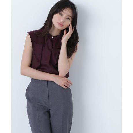 縦に流れるラッフルフリルがポイントのブラウス。大きめのフリルが顔まわりを華やかに見せながら、襟のゴールドカラーの釦がきらっとポイントに。フリルを2重にしているので動きが出て、よりラッフルフリルを印象的に演出。ハイウエストのスカートやパンツを合わせたスタイリングがおすすめです。<素材>柔らかく軽やかな合繊シアー素材を使用。程よくシャイニーな光沢感があります。<詳細>仕様・前ボタン裏地・あり透け感・あり / 光沢・ややあり / 伸縮性・なし生地の厚さ・薄手※モデルの着用画像の場合、光の当たり具合により、実際の色味と異なって見えることがございます。色味は、商品単体の画像をご参照ください。