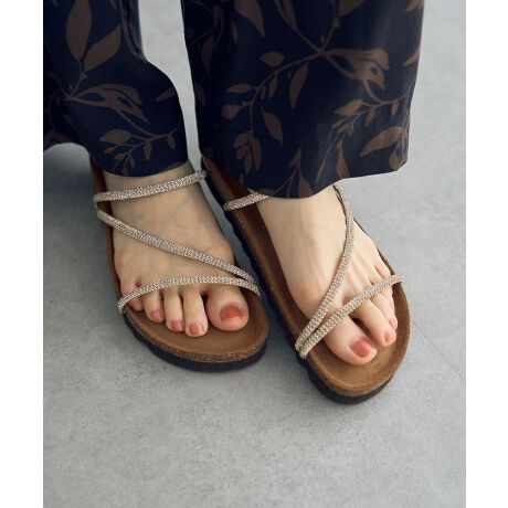 トップのビジューベルトが足元に華やかさをプラス。細いラインが甲に映え、ちらりと覗くスタイリングのアクセントに光ります。