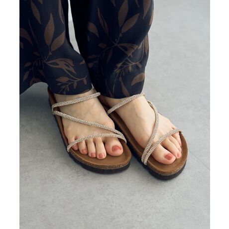 トップのビジューベルトが足元に華やかさをプラス。細いラインが甲に映え、ちらりと覗くスタイリングのアクセントに光ります。
