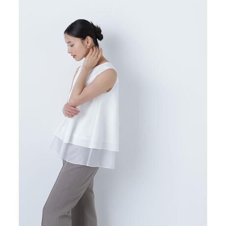異素材が2段にレイヤードされた風合いの違いを楽しめるデザインで、裾のシアー感がスタイリングに軽さを出してくれるブラウス。裾まわりが緩やかに広がるテントラインは、パンツもナロースカート合わせもおすすめ。肌離れの良いAラインのシルエットなので涼しく着ていただけます。<素材>しなやかなハリと落ち感のあるドライタッチな素材をベースに、裾は軽さのあるシアーなブラウス素材を使用しています。<詳細>仕様・後ろボタン裏地・あり透け感・なし / 光沢・なし / 伸縮性・なし 生地の厚さ・普通※モデルの着用画像の場合、光の当たり具合により、実際の色味と異なって見えることがございます。色味は、商品単体の画像をご参照ください。