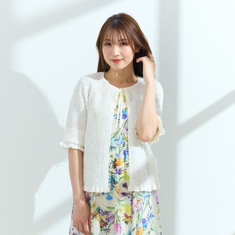 フロントはボタンレスでリボンを結んで閉めるボレロ風のデザイン。