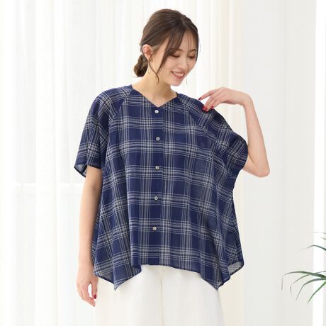 ■イレギュラーヘムで軽い印象にしてくれる、Vネックチェック柄ブラウス■