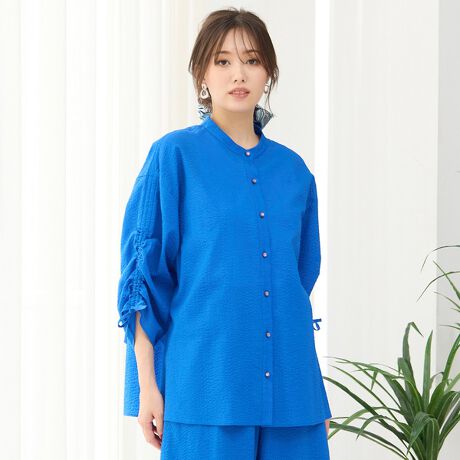 スタンドカラーできちんと感はありながら、ドロップショルダー、後ろ切り替えにギャザー入りで、リラックスできるシルエットに。