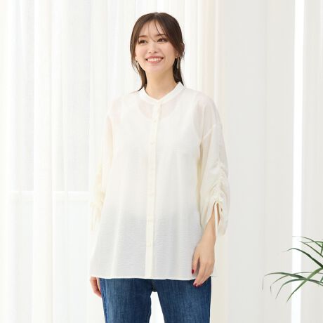 スタンドカラーできちんと感はありながら、ドロップショルダー、後ろ切り替えにギャザー入りで、リラックスできるシルエットに。