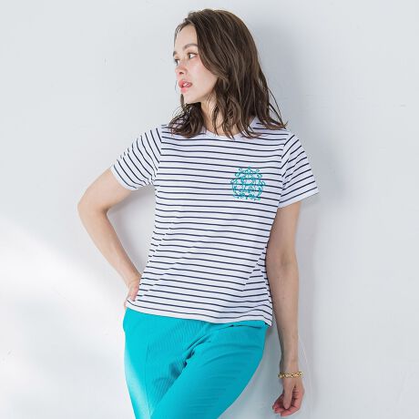 エンブレム風のロゴ刺繍が上品なワンポイント刺繍Tシャツ。