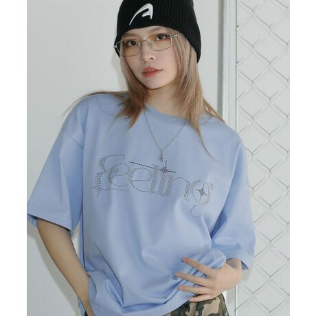 ・フロントにきらきらと輝くラインストーンロゴがポイントのTシャツ。