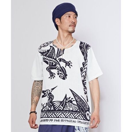 【Amina×洋輔】肌触りの良いインド綿のメンズトップス。「モオ」はハワイ語でトカゲという意味で様々な生き物に化けられる力を持つとされ、数々のハワイ神話にも登場します。自然や人間の関係を象徴し、「調和」の意味を持つとされます。トカゲから始まり、様々な生き物に化ける変芸自在な様子をトライバル柄に落とし込みました。