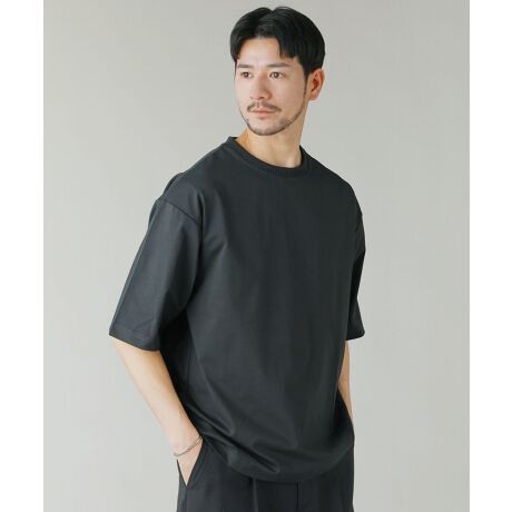 デザインのアクセントに太めに編まれたリブ襟を採用しました。ポンチ生地タイプは着回しやすいシンプルなTシャツ型に。カノコ生地タイプは、サイドの縫い目をフロント側に入れ込んで前後差を付けた、立体的な作りとなっております。どちらもドロップショルダーに5分袖と、トレンドのオーバーサイズ感を演出するデザインを取り入れつつも、大きすぎずコンパクト過ぎないルーズシルエットに仕上げています。