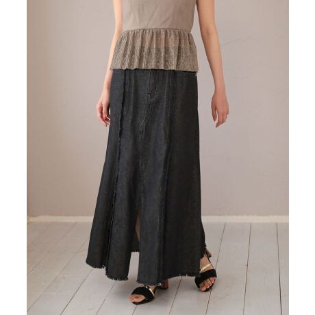 マーメイドラインがフェミニンなデニムスカート。センターに切り替えとフリンジディテールを施した個性際立つデザインで、シンプルなトップスに合わせるだけでサマ見えします。バックウエストにゴムを配したリラクシーな穿き心地も魅力的。シャツを合わせたクリーンなコーディネートや、ジャケットスタイルの外しアイテムとしてもおすすめです。透け感[なし]