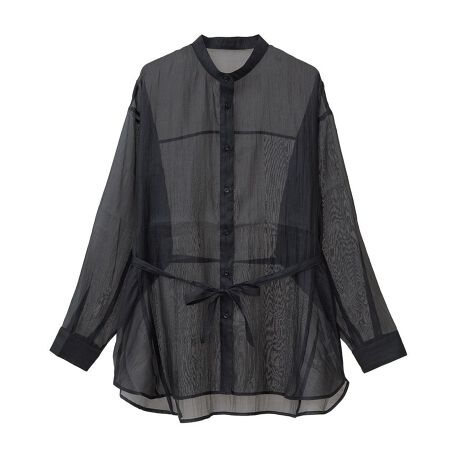 シアーな素材感がヘルシーな着こなしを演出するデザインシャツ。ややドルマンスリーブのゆとりのあるフォルムにすっきりとしたバンドカラーを合わせ、カジュアルながらも女性らしい着こなしを楽しめます。長めの着丈でスタイルアップ効果にも期待。取り外し可能なウエストリボン付きでスタイリングの幅も広がるおすすめのアイテムです。透け感[あり]