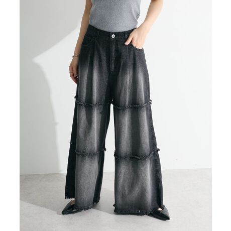 リラックス感のあるワイドシルエットがポイントのデニムパンツ。ティアード状の切り替えとフリンジディテールが目を惹き、シンプルなトップスに合わせるだけでも華やかなスタイリングが完成します。バックウエストにゴムを配し、快適な履き心地なのも魅力的。シャツを合わせたクリーンなコーディネートやジャケットの外しアイテムとしても活躍します。透け感[なし]