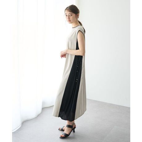 異素材プリーツの切り替えデザインがモード感あふれるワンピース。