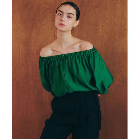 クルーネックとオフショルダーの2WAYで楽しめるギャザーブラウス。