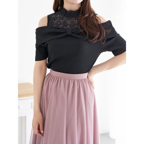 ・レースの繊細な透け感とオフショルデザインがフェミニンな甘さをプラス。
