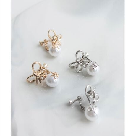 華奢なリボンデザインとパールがポイントのイヤリング。