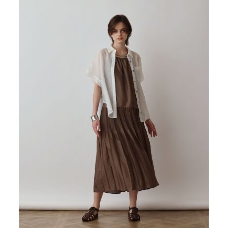 ナチュラルなムード漂う、シアーオーガン地でお作りしたドルマンシルエットシャツ。ややマットな質感で、少しワッシャーもかかったような美しいオーガン素材を使用。ゆったりとしたドルマンスリーブは、身体から離れるため通気性が良く、汗ばむ季節でも快適です。少し肩にかかるくらいの袖丈は気になる肩や二の腕も隠れる為、ボタンを閉めてブラウス感覚で着ても可愛いですが、サマードレスの上から羽織ったり、タンクトップやベアトップに合わせたり、真夏の軽い羽織りとして重宝。お揃いのスカートとセットで着る事で、新鮮なスタイリングもお楽しみいただけます。清涼感溢れるホワイトと、夏のシンプルになりがちなスタイリングに華やかさを演出する綺麗な発色のパープルやイエローの3色をご用意しました。