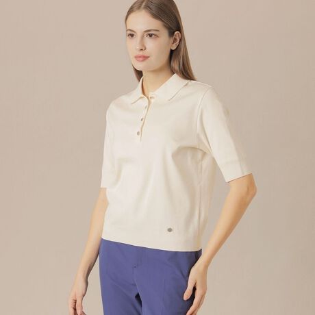 上品な素材感を生かしカジュアルになり過ぎないよう仕上げたポロシャツです。繊細なリブの編み出しに、袖は二の腕が隠れる安心丈で前立ての上品なメタルボタンもポイントです。