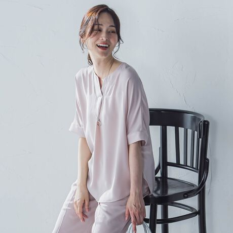 落ち感のあるとろみ素材が上品な印象を与えるキーネックブラウス。