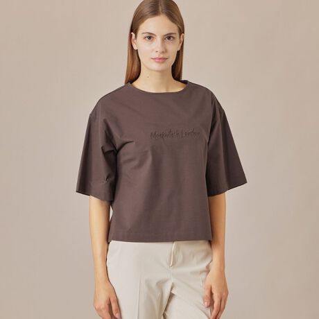 胸元にロゴ刺繍を施したトップスです。ハリのある素材で体のシルエットを拾いにくく、コーディネートしやすいアイテムです。