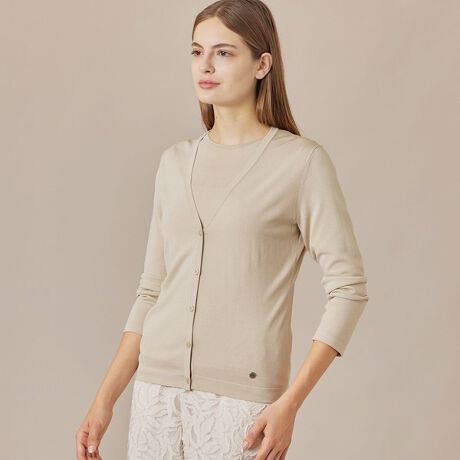 シンプルでコーディネートしやすいVネックカーディガンです。同素材のプルオーバー(品番:G5N54598)とアンサンブルとしても着用いただけ、素材を生かした着心地の良いアイテムです。