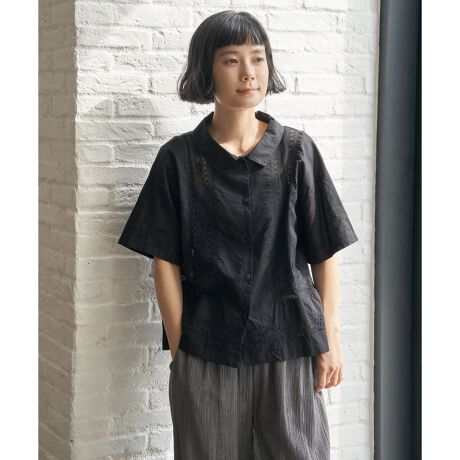 贅沢にレースをあしらった切り替えデザインが印象的なシャツ。