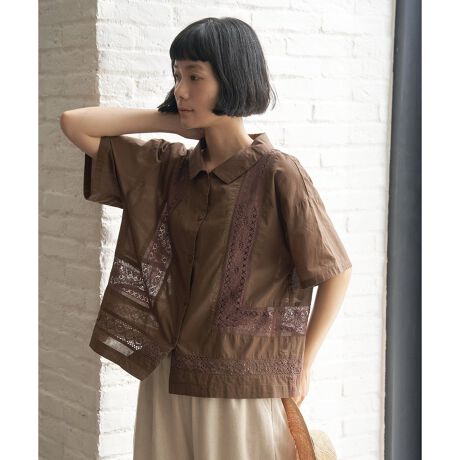 贅沢にレースをあしらった切り替えデザインが印象的なシャツ。