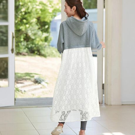 レースがドッキングされてる1枚でコーデ完成のパーカーワンピース。裏起毛素材で冬に大活躍素材。レースの大柄花柄で大人女子を演出。