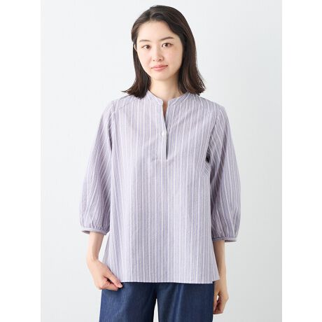 夏にぴったりな凹凸感が涼しいサッカー素材のストライプ柄のブラウス。お顔周りがスッキリ見えるバンドカラーと袖口にギャザーが入ったナチュラルフェミニンなブラウスです。