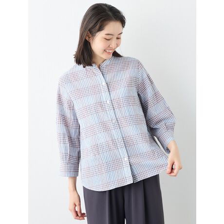 清涼感のあるドライタッチなチェック柄のブラウス。生地の表面をサッカー調に仕上げ、肌に心地よい素材に仕上げました。袖にボリュームを持たせた7分袖でかわいらしさを出しました。衿元は顔回りがすっきり見えるバンドカラーデザインです。前開きなので羽織としても活躍します。