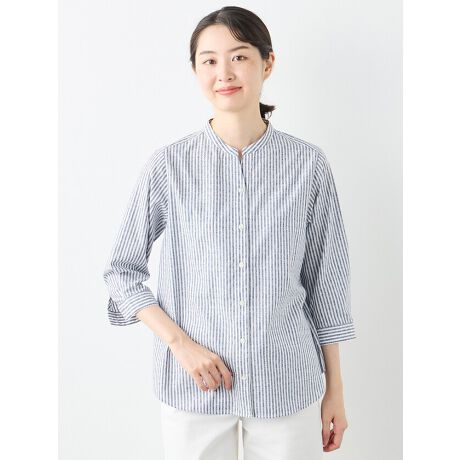 先染のストライプにフラワージャガードを織り込んだ生地のブラウス。上品できちんとした印象の1枚です。お顔回りがスッキリ見えるバンドカラーデザイン。清涼感あるネイビー、グレーの2色展開です。