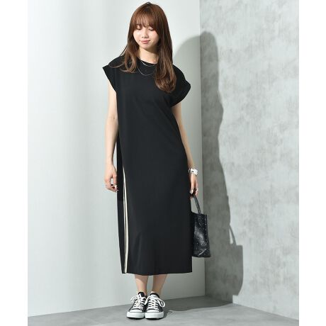 本体はストレッチ性に優れたカット素材を使用。カジュアル見えしないジョーゼットの表面感も魅力の1つ。ストレスフリーに着まわせ、布帛見えの素材できちんと感もしっかりKEEPできるのが嬉しいポイントです。配色のサイドラインですっきりした印象に。またストンとしたシルエットで華奢見え効果も◎