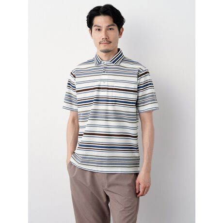 [型番:7204744]ランダムなボーダー柄の半袖ポロシャツ。ハニカムやタックを組み合わせ、他にはないオリジナルな組織感を表現。通気性が良く、清涼感のあるドライタッチな鹿の子生地を採用。1枚でもジャケットのインナーとしても活躍する便利なアイテム。
