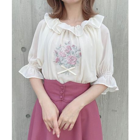 フロントのブーケ刺繍が目を惹く、フェミニンなブラウス。
