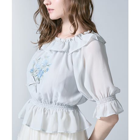 フロントのブーケ刺繍が目を惹く、フェミニンなブラウス。