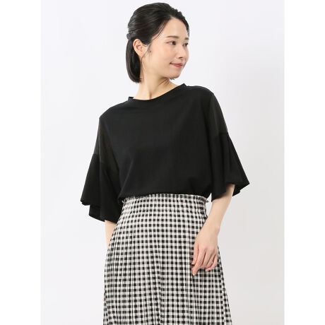 レーヨンにナイロンを混紡したカットソー素材です。畝のようなピケの凹凸感、落ち感のある滑らかな肌触り、上品な光沢感、サラッとした涼しげな着心地が特徴です。袖部分はシアー感のある布帛生地で切り替えています。