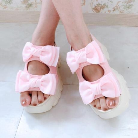 厚底サンダルに大きなリボンが付いたガーリーサンダル