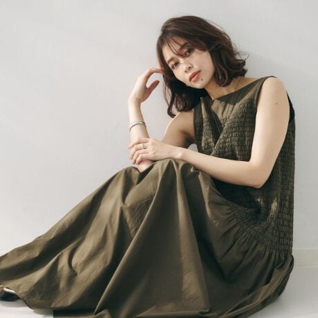 ボートネックの夏にピッタリなロングワンピースは、バストからヒップ手前までシャーリングを配したデザインになっています。