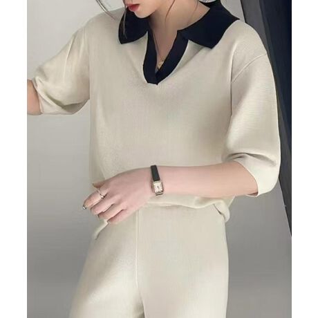 コントラストカラーの襟がポイントになった、大人可愛いニットセットアップ。